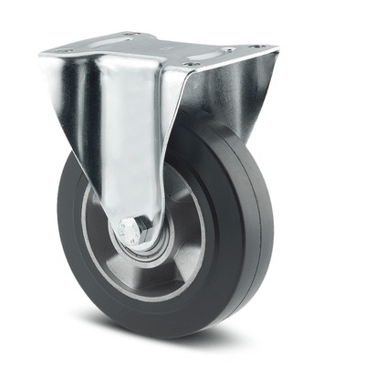Roata fixa din poliamida, fixare pe placa, calea de rulare din cauciuc elastic gri D 125 mm