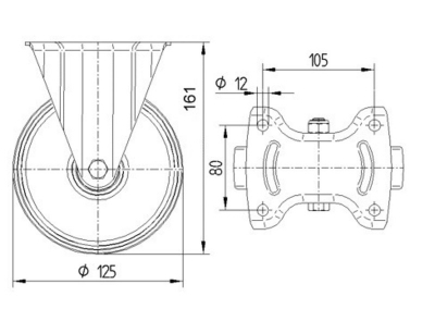 Roata fixa din otel, fixare pe placa, calea de rulare din cauciuc plin gri, D 125 mm