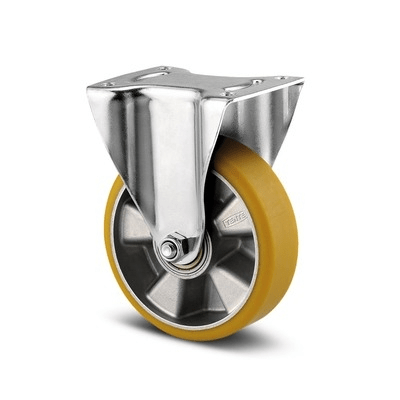 Rolă fixă, Furcă din tablă din oţel, ambutisată, zincată, axul roţii cu şurub şi piuliţă, sistem de prindere tip placă. Jantă din aluminiu, suprafaţă de rulare din poliuretan, rulment de precizie