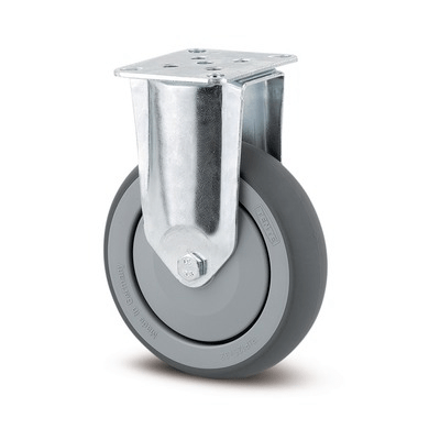 Rolă fixă, furcă din tablă de oţel ambutisat, zinc-cromatizată, , ax cu şurub, sistem de prindere tip placă. Latura mai lungă a plăcii de suport este perpendiculară pe direcţia de mers. Jantă din polipropilenă, suprafaţă de rulare din cauciuc gri tip TENTEprene (cauciuc termoplastic), non-marking, apărător, rulment de precizie, cu apărători