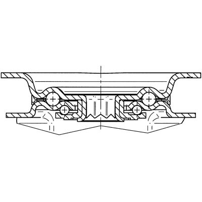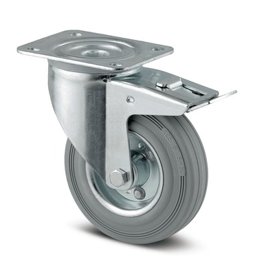 Role pivotante cu blocare totală, pedala pe partea opusă direcţiei de rulare, Furcă din tablă din oţel, ambutisată, zincată, cap pivotant cu rulment pe două rânduri de bile, axul roţii cu şurub şi piuliţă, flanşă antipraf, sistem de prindere tip placă. Jantă din tablă din oţel, ambutisată, suprafaţă de rulare din cauciuc plin de culoare gri, non-marking, rulment cu role ace