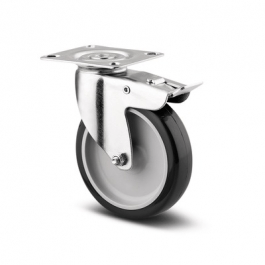 Role pivotante cu blocare totală, pedala pe partea opusă direcţiei de rulare, furcă din tablă din oţel, ambutisată, zincată, rând dublu de bile în capul pivotant, sistem de prindere tip placă. Jantă din polipropilenă, Suprafaţă de rulare: poliuretan, rulment plan (bucşă antifricţiune)