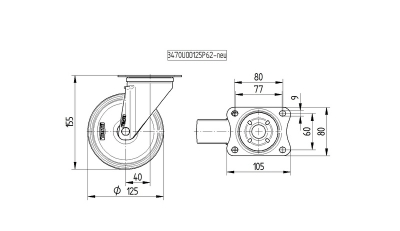 Roată pivotantă, Furcă din tablă din oţel, ambutisată, zincată, cap pivotant cu rulment pe două rânduri de bile, axul roţii cu şurub şi piuliţă, flanşă antipraf, sistem de prindere tip placă. Jantă din aluminiu, suprafaţă de rulare din poliuretan, rulment de precizie