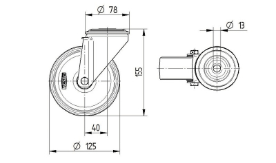 Roata pivotanta din tabla de otel, fixare pe bolt ,calea de rulare din cauciuc plin negru, D 125 mm
