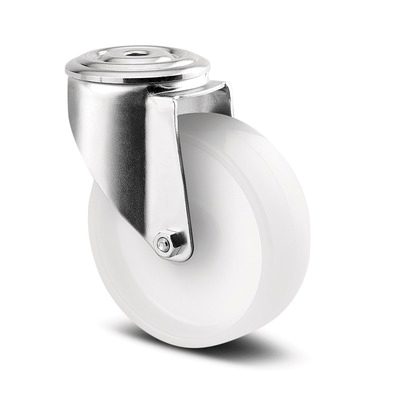 Roată pivotantă, Furcă din tablă din oţel, ambutisată, zincată, cap pivotant cu rulment pe două rânduri de bile, axul roţii cu şurub şi piuliţă, flanşă antipraf, sistem de prindere tip placă. Roată din poliamidă, rulment plan (bucşă antifricţiune)