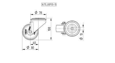 Roata pivotanta din polipropilena, fixare pe placa, calea de rulare din cauciuc negru plin, D 80 mm